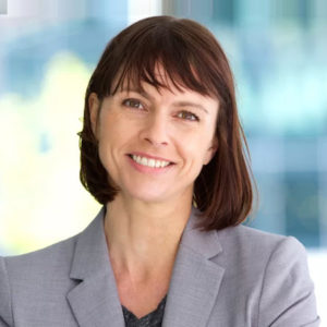 Donnie Lewis, eine Frau mit glattem braunem Haar und Pony, trägt einen hellgrauen Blazer und ein dunkles Top und lächelt herzlich in die Kamera. Der sanft unscharfe Hintergrund lässt auf eine helle, moderne Inneneinrichtung schließen.