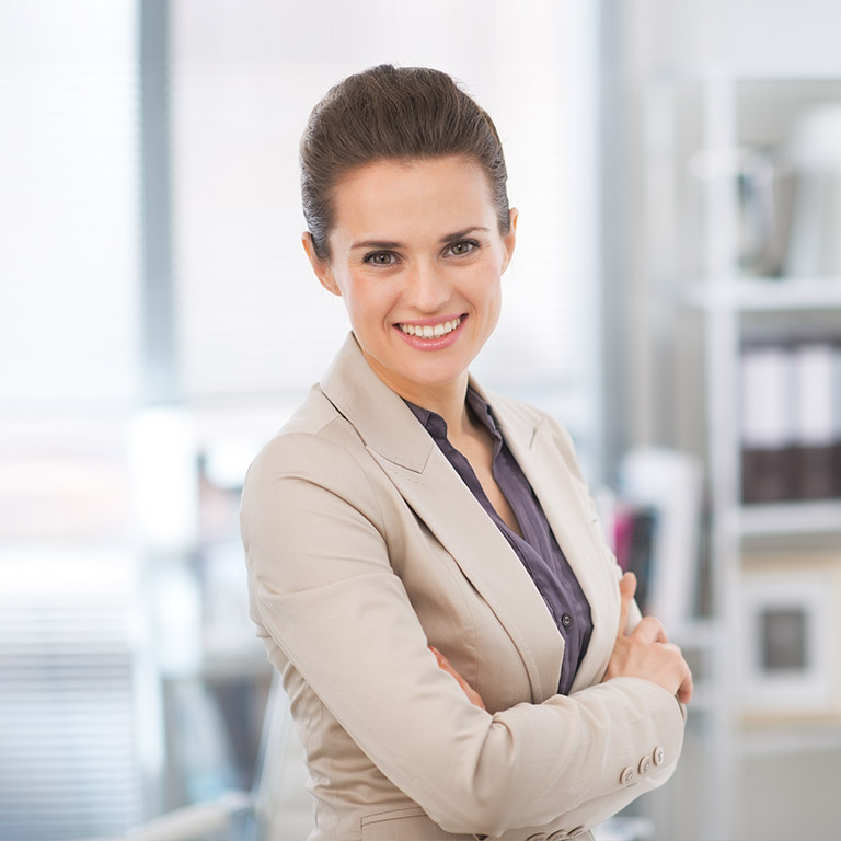 Eine lächelnde Frau mit hochgestecktem braunem Haar, einem beigen Blazer und einer dunklen Bluse steht mit verschränkten Armen in einem hellen Büro mit Regalen und Dokumenten hinter ihr, was die professionelle Atmosphäre von Joshua Jordans Arbeitsplatz widerspiegelt.