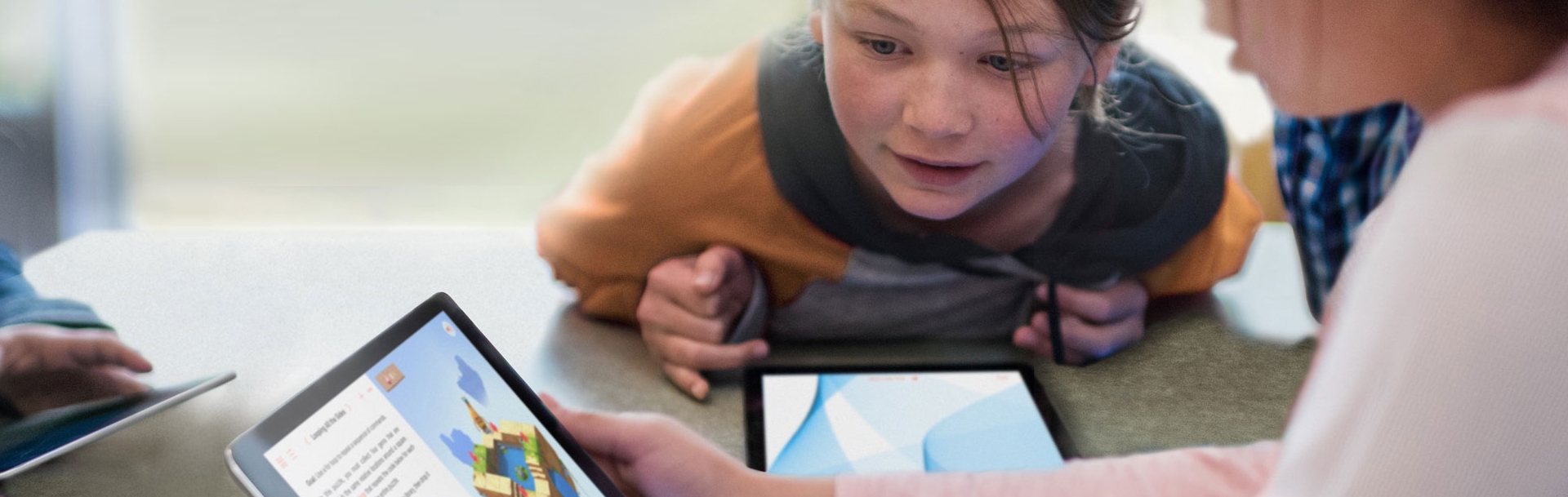 Zwei Kinder sitzen an einem Tisch und konzentrieren sich auf ein Tablet, das eines in der Hand hält. Ein weiteres Tablet liegt auf dem Tisch. Auf dem Bildschirm läuft ein buntes Lernprogramm. Die Kinder wirken engagiert und interessiert.