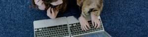 Von oben betrachtet sitzen zwei Kinder auf einem blauen Teppich und benutzen nebeneinander angeordnete Laptops. Vielleicht träumen sie sich zukünftige arbeitsmarktpolitische Projekte aus, während das eine tippt und das andere zusieht.