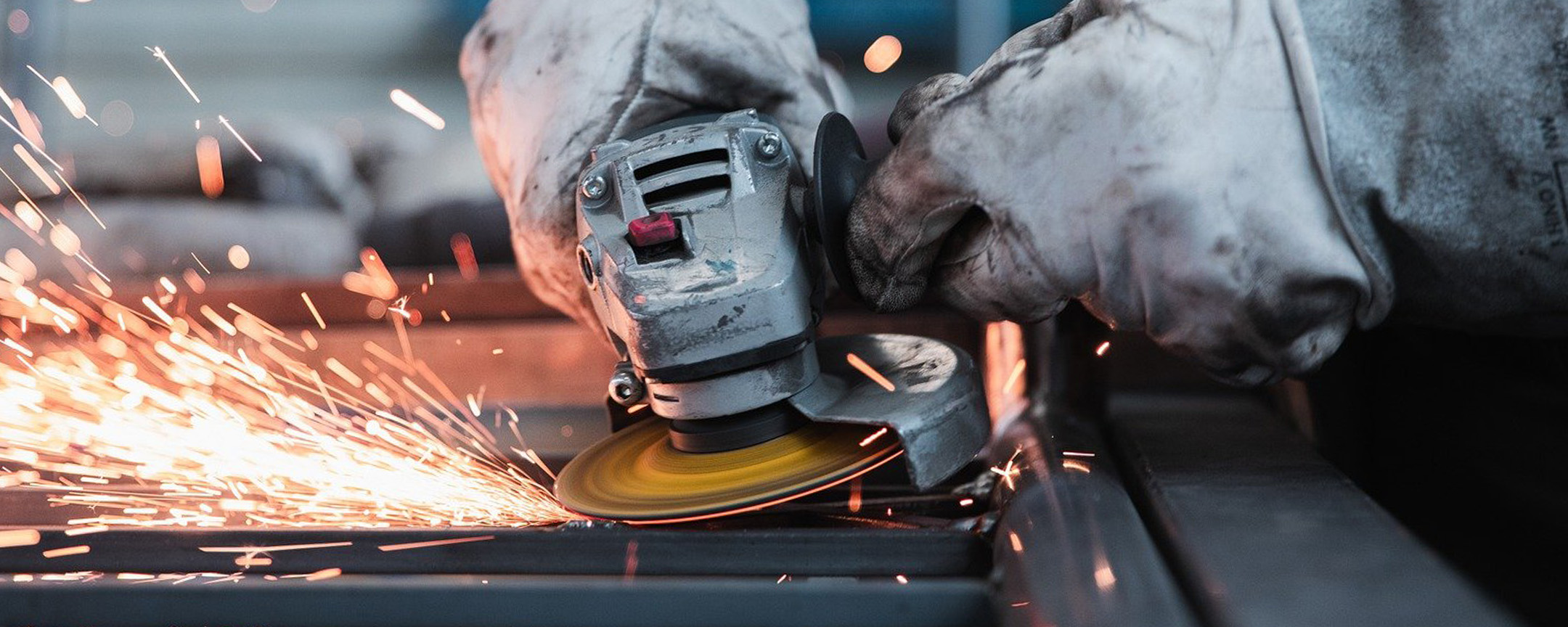 Eine Person mit Schutzhandschuhen bearbeitet Metall mit einem Winkelschleifer und erzeugt dabei leuchtend orangefarbene Funken – eine dynamische Szene, die bei arbeitsmarktpolitischen Projekten zur Verbesserung von Fähigkeiten und zur Unterstützung des Arbeitsmarktes häufig vorkommt.