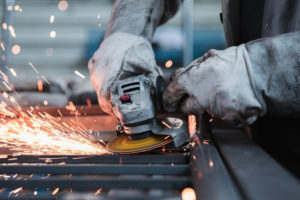 Eine Person mit Schutzhandschuhen schneidet mit einem Winkelschleifer Metall und erzeugt dabei leuchtend orangefarbene Funken in einer Werkstattumgebung – einer Umgebung, die man oft in arbeitsmarktpolitischen Projekten sieht.